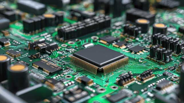 Green electronic circuit board motherboard filled with processors and digital components, representing modern computer network technology and data flow