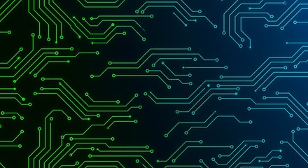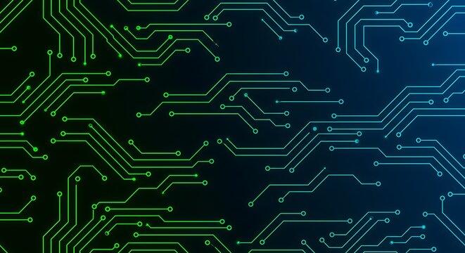 Green circuit board technology background with microchips and electronic components, representing connectivity and innovation in the digital age