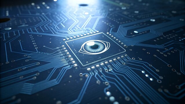 Artificial intelligence concept with eye on computer chip and circuit board