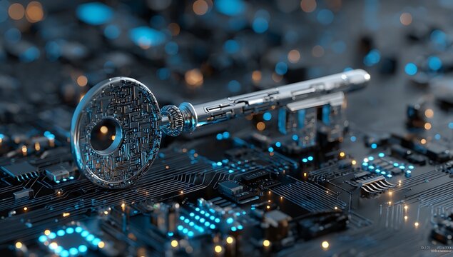 a golden ornate key hovers above a glowing blue padlock with intricate circuit board details and digital patterns high quality professional