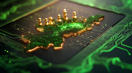 A futuristic representation of map, featuring a circuit board design illuminated in green with golden chess pieces symbolizing strategy.