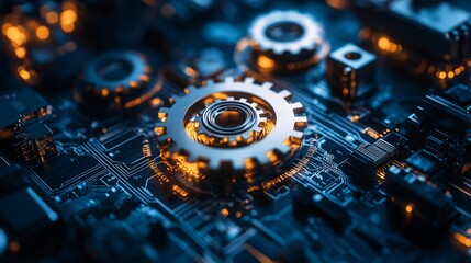 Close-up view of complex circuit board with intricate components, glowing lights, and detailed textures..