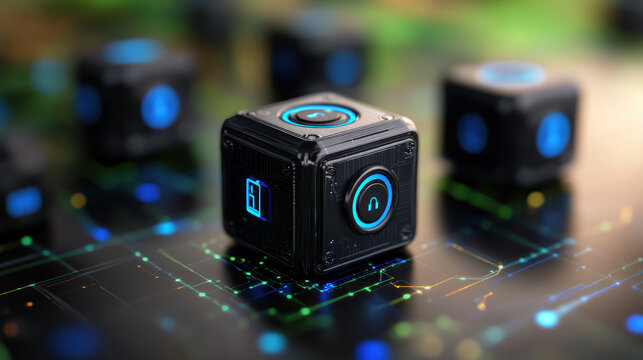 Digital wallet key cube with glowing lock icon and circuit lights, futuristic security device