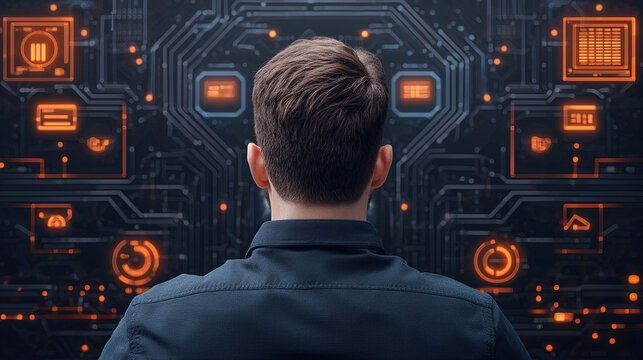man in dark shirt stands before digital interface with glowing orange metrics, symbolizing futuristic data analysis and technology. scene conveys innovation and focus