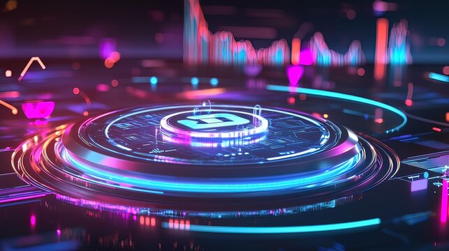 Futuristic glowing digital interface with circular data display and vibrant neon lights.