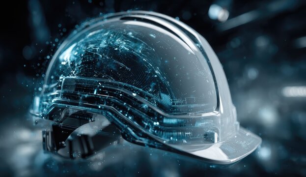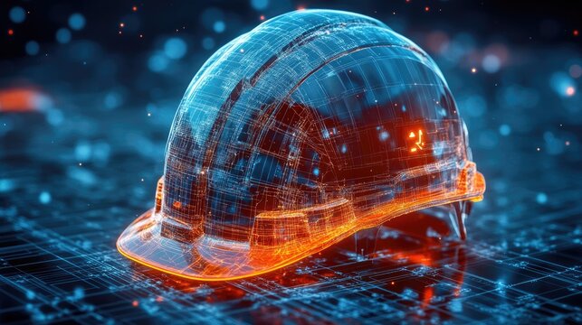Futuristic safety helmet overlaid with digital network.