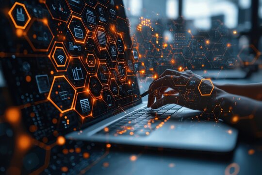 Hands Typing on Laptop Surrounded by Digital System Interface in Futuristic Style
