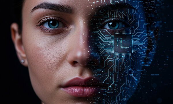 A futuristic depiction of a human face overlaid with glowing circuit board patterns, symbolizing artificial intelligence or technological integration.