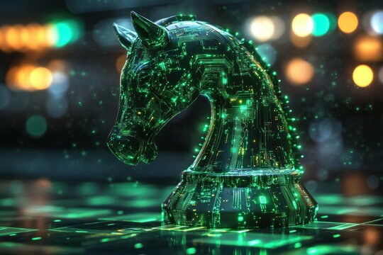 Futuristic digital chess piece with green circuitry and glowing elements, representing strategy, technology, and innovation in gaming and artificial intelligence