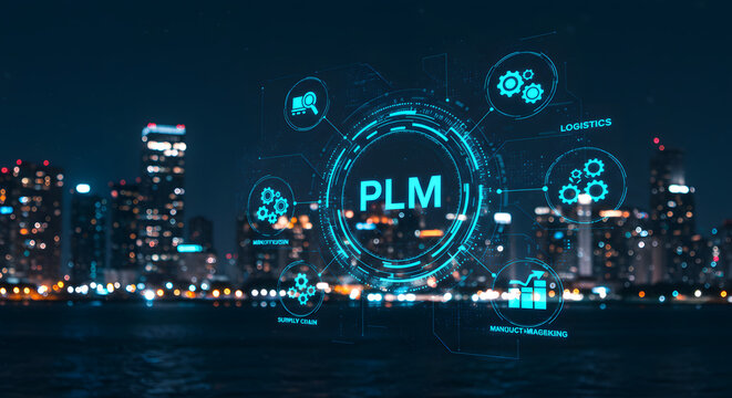 Futuristic digital interface displayed on a skyscraper overlooking a city at sunset.