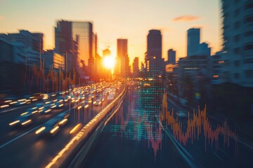 A vibrant cityscape at sunset, showcasing bustling traffic with a digital overlay of line graphs representing data trends
