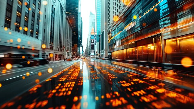 Financial data overlaying modern cityscape and traffic