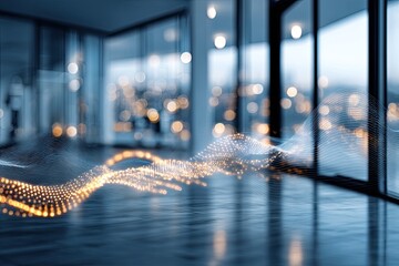 An office interior with a digital light stream overlay and a blurred cityscape through windows