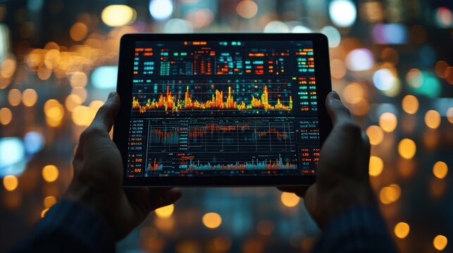 Person analyzing financial data on a tablet amidst a blurred cityscape background