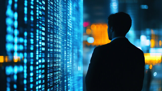 financial analyst observing data trends on digital display, showcasing technology and finance