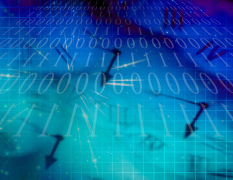 Futuristic clock composed of digital code streams.