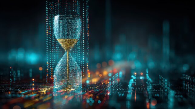 Abstract Digital Hourglass Symbolizing Time And Technology With Glowing Blue And Orange Particles Over A Blurry Cityscape Background