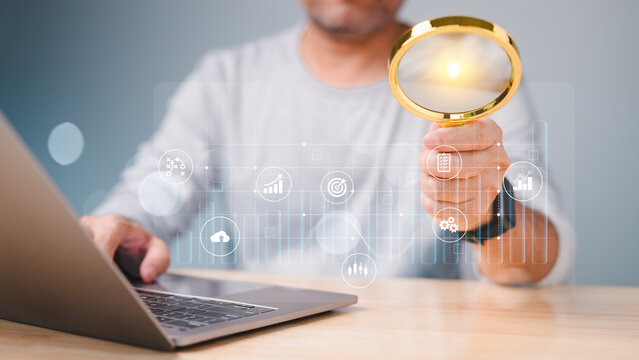 A man is holding a magnifying glass over a laptop computer. The laptop screen shows a variety of icons and symbols, including a clock, a smiley face, and a dollar sign, graph