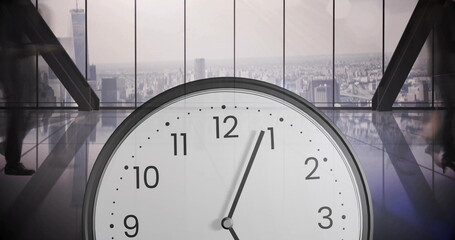 Composition of happy diverse business team in meeting over interface with clock and data processing