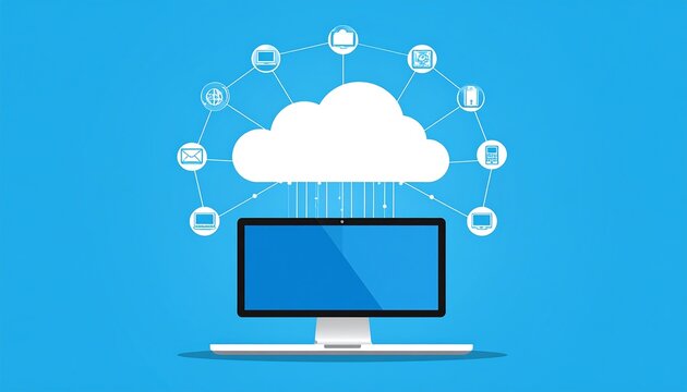 A blue illustration showing a cloud computing concept with a monitor, data cloud, and connected digital devices