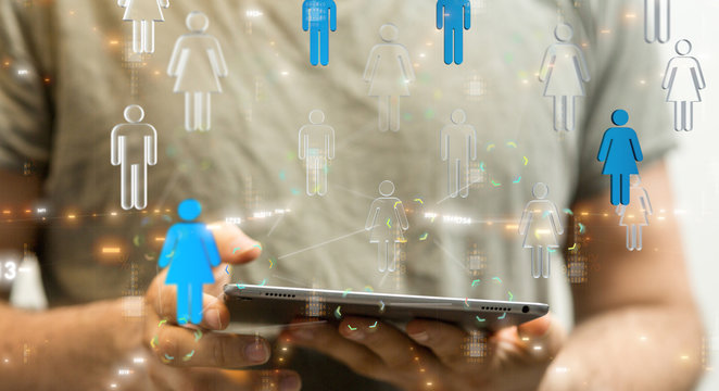 Abstract cloud computing concept with smartphone user outdoors