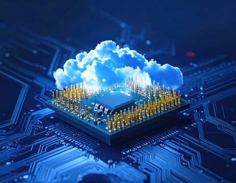 Depiction of a microchip with a cloud above it, set against a dark blue motherboard background