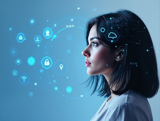 Woman with short dark hair looking forward, surrounded by glowing digital interface elements on a blue background. Concept of future technology and AI. Ai generative