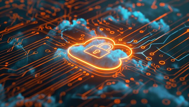 A glowing cloud with a padlock icon surrounded by circuit patterns, symbolizing cloud security and data protection.
