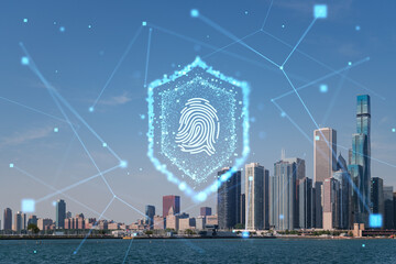 Information technology concept over modern skyline of Chicago, USA with tech icons.