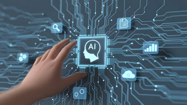 A glowing blue digital brain icon with circuit patterns and data flow on a dark background, representing AI and technology.