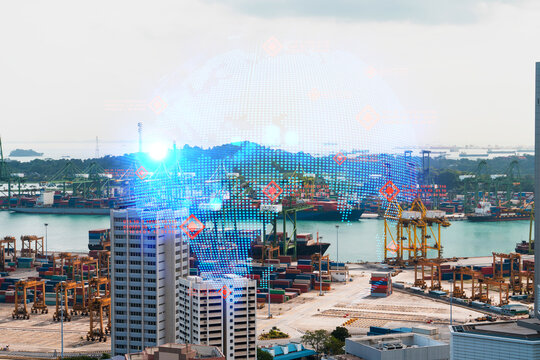World planet Earth map hologram over panorama city view of Singapore, Asia. The concept of international connections and business. Multi Exposure.