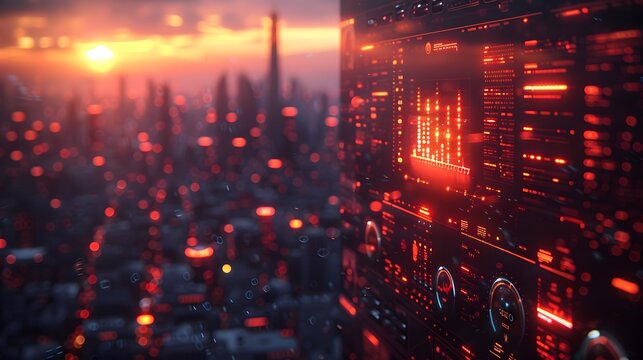 Futuristic cityscape at sunset with illuminated digital interface overlay, showcasing advanced technology and urban development.