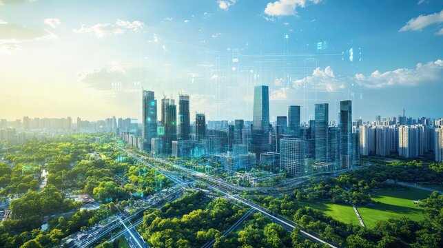 An aerial view of a modern city skyline with green spaces and a digital network overlay.