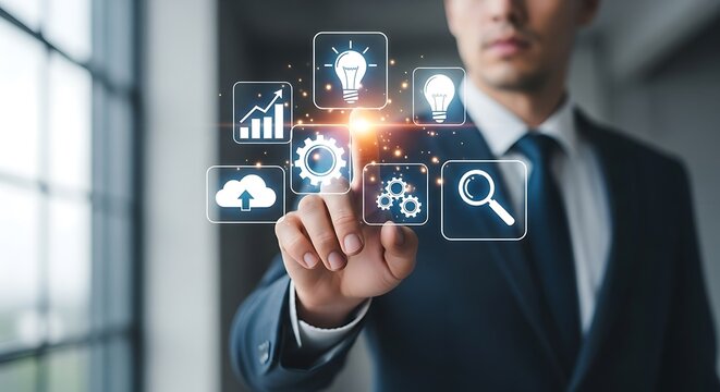 Man in suit interacting with digital icons representing business concepts and technology solutions