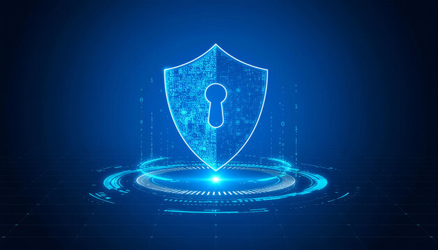 Cybersecurity shield protection with advanced digital technology and glowing interface offers robust defense for data privacy and network safety online