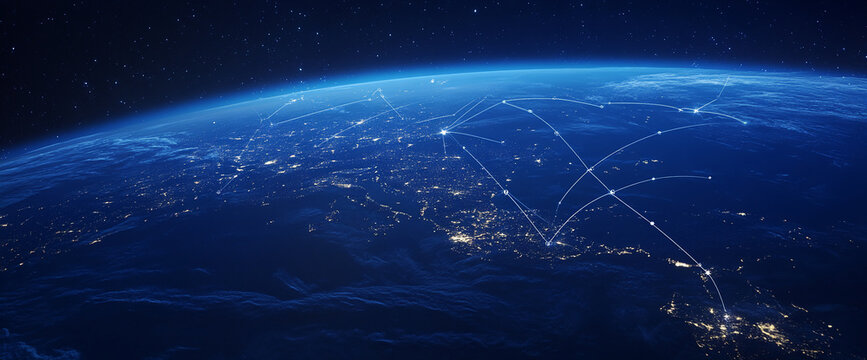 Earth view from space at night, displaying interconnected lines of communication and global connectivity. The image symbolizes technology, network connections, and a connected world.