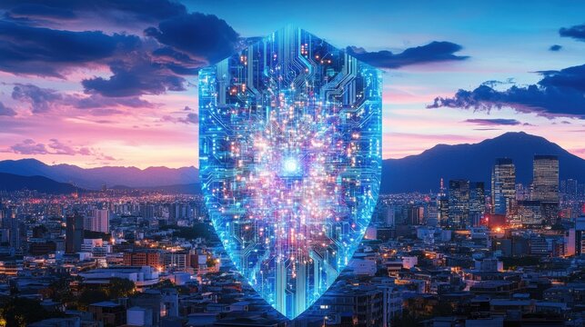Digital Shield Symbolizing Cybersecurity Over Cityscape at Dusk