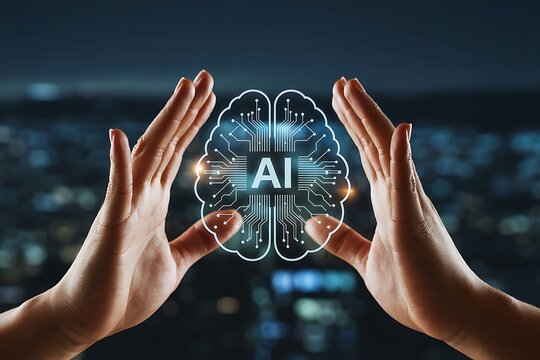 Hands cradle artificial intelligence brain concept over cityscape, symbolizing innovation and advanced technology.