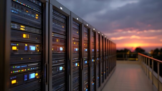 Server racks with illuminated displays stand in a row against a dramatic twilight sky
