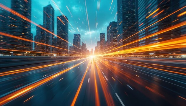 Futuristic city with motion blur. Orange light trails show high speed data transfer tech. Modern skyscrapers skyline, digital connection, information flow, network concept.