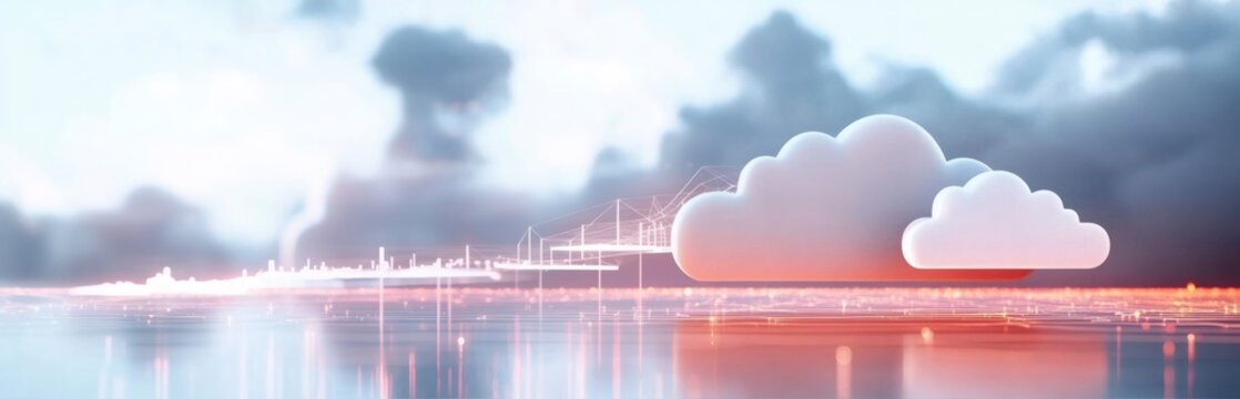 Cloud computing infrastructure over a digital landscape. Futuristic technology concept for data storage and network communication.