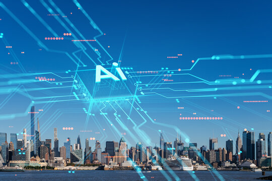 AI technology concept over Manhattan skyline in New York City with digital circuit overlay on clear blue sky background, symbolizing innovation and future.