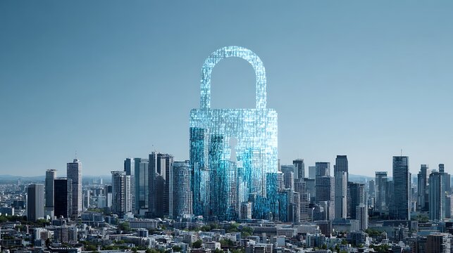 Digital cityscape with an overlay of a glowing padlock, symbolizing cybersecurity in urban areas