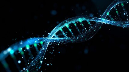 A glowing blue DNA double helix with intricate texture on a dark smoky scientific background