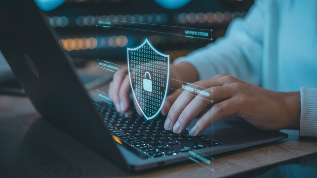 Cybersecurity Concept with Laptop and Shield Graphic Overlay Displaying Data Protection and Encryption