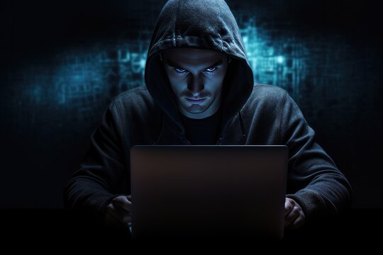 A person in a dark hoodie types on a laptop displaying green code. The image represents themes of hacking, cybersecurity, digital security, and online anonymity in a low-light environment.
