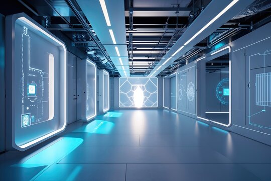 Futuristic Server Room With Glowing Holographic Data and Advanced Sci-Fi Atmosphere
