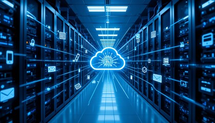 futuristic data center hallway illustrating secure cloud computing and digital information flow