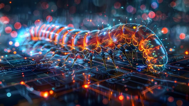 Glowing High Tech Centipede Navigating Through Futuristic Digital Landscapes in Virtual Reality