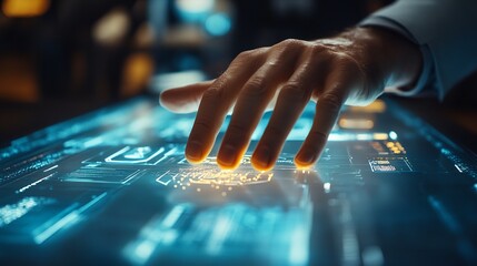 A hand is touching a screen with a blue background. Concept of control and precision, as the hand is reaching out to interact with the digital display. The blue background adds a sense of calm